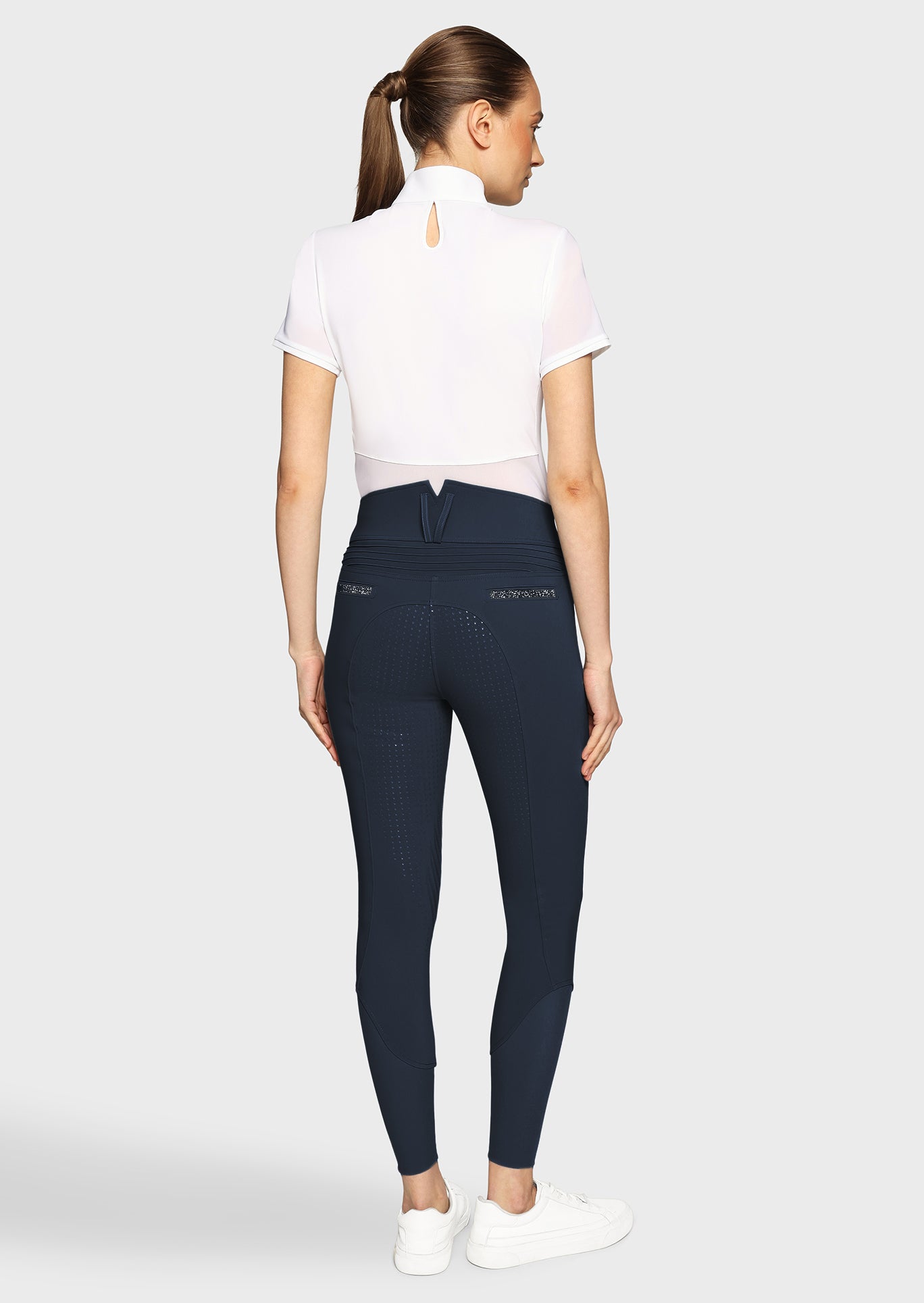 Le pantalon est confectionné dans un tissu technique italien de haute qualité, respirant, extensible et résistant. Le Claranova offre ainsi un confort durable, même lors des entraînements intensifs ou des journées de compétition. Les détails luxueux, tels que les inserts Swarovski Crystal Fabric sur les passants de ceinture et les poches arrière, apportent une touche d’élégance subtile. Les plis signature Samshield à l’arrière soulignent le raffinement du design.