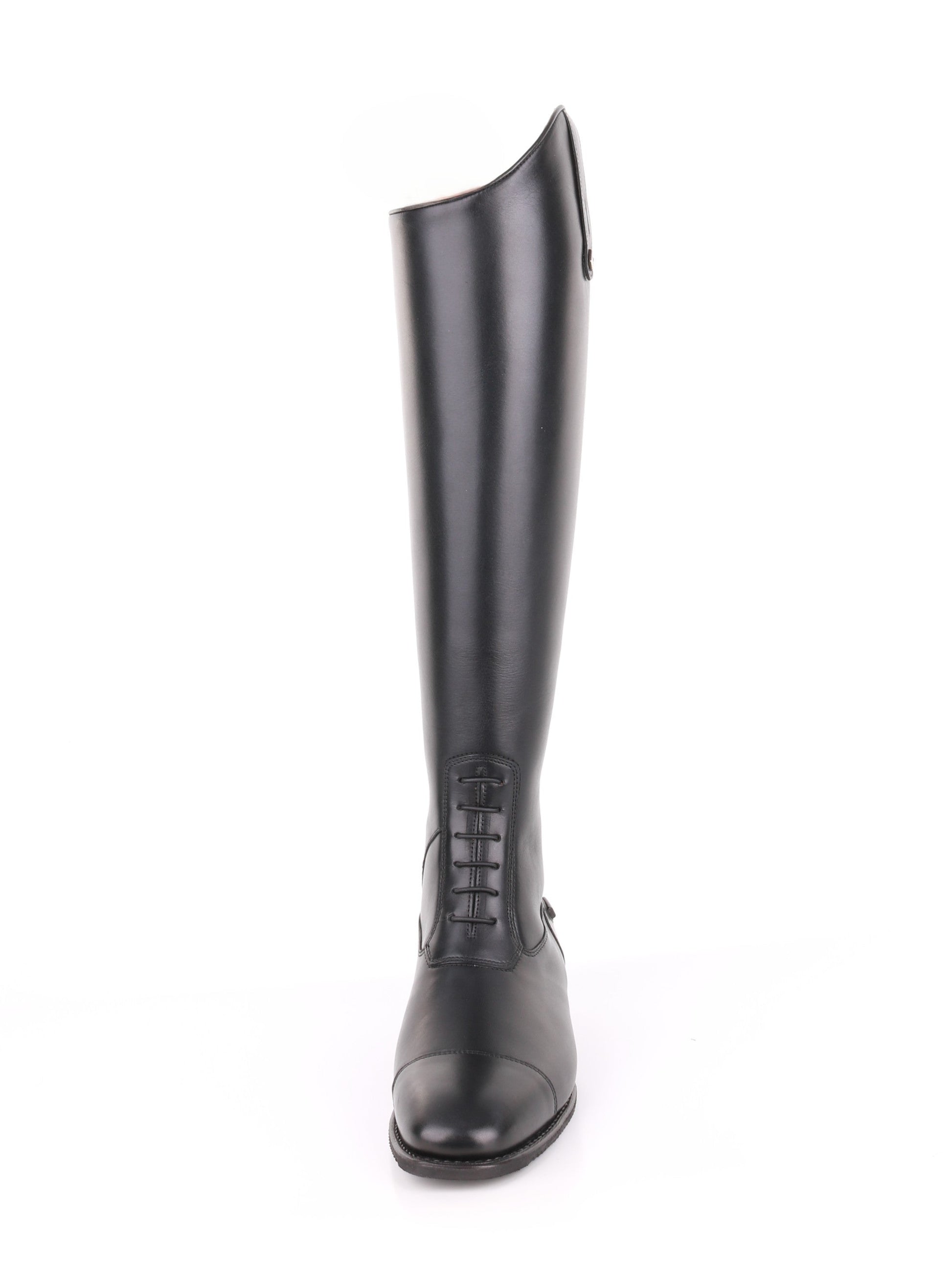 La botte est dotée d’un laçage sur le cou-de-pied à l’avant et d’une fermeture éclair à l’arrière de la jambe, protégée par deux rabats de sécurité (en haut et en bas). Elle est également équipée de supports d’éperons.