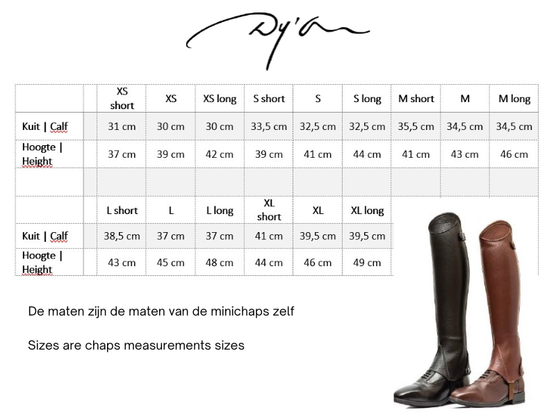 Un minichap en cuir très souple de la marque haut de gamme Dy'on. Le Classic chap est fabriqué en cuir de 16 mm d'épaisseur et est équipé d'une solide fermeture éclair YKK à l'arrière. La fermeture éclair est entourée d'un élastique pour un confort supplémentaire. Il y a également une bande élastique sous le pied, ce qui permet d'enfiler et de retirer facilement le chap.