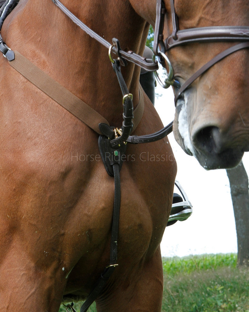 Ce harnais se fixe entre les membres avant à la sangle et de chaque côté à l'anneau de la selle.