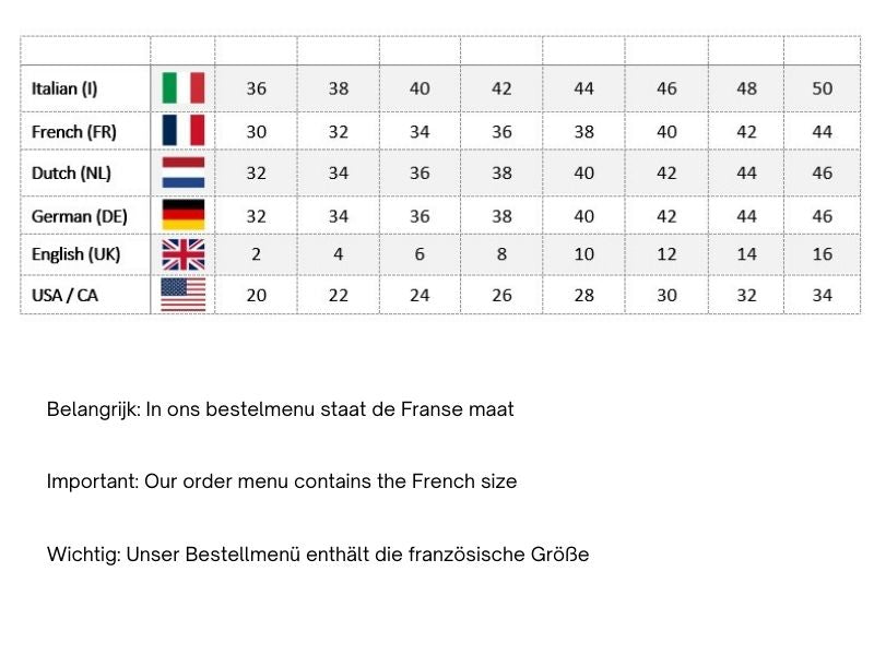 - Nous utilisons la taille française (FR) pour la livraison, voir le tableau des tailles.