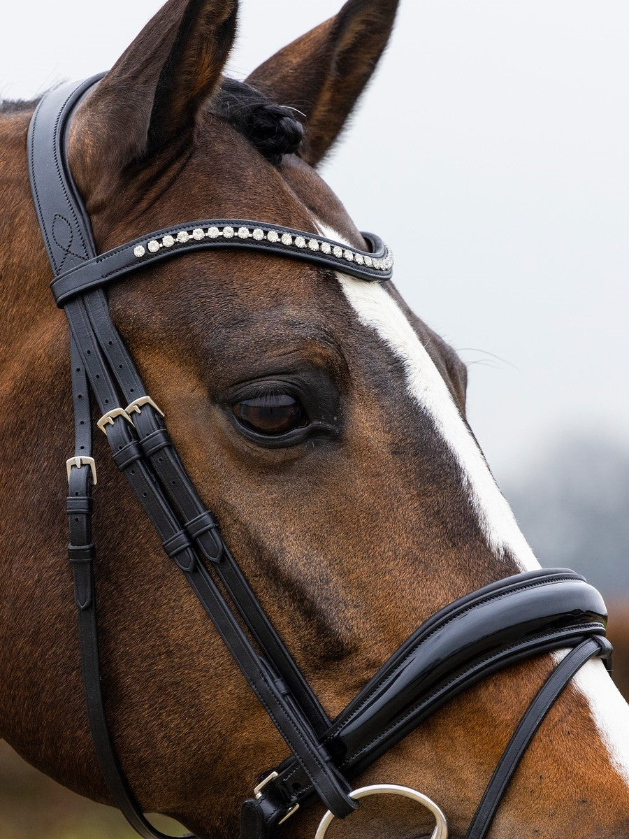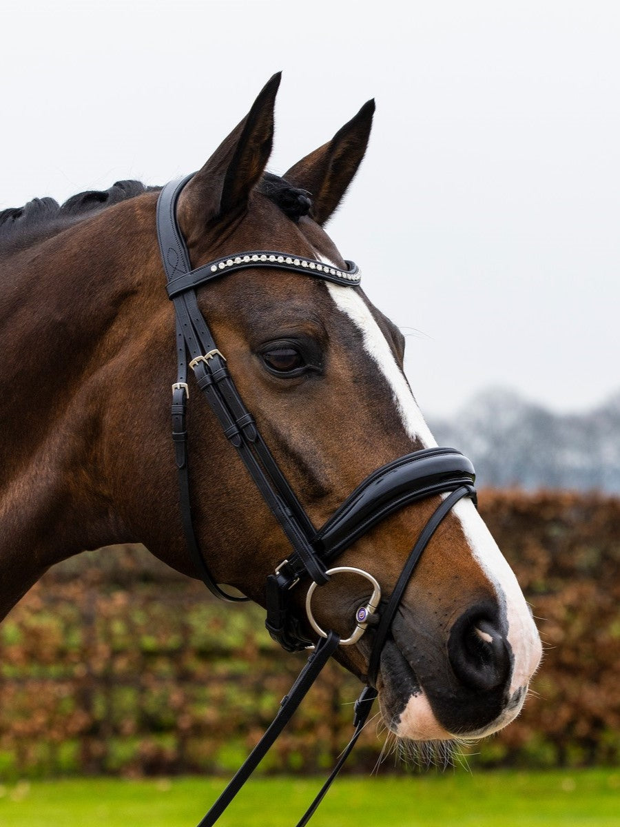 Le bridon de dressage TRUST Rotterdam est un magnifique bridon avec une large muserolle en cuir verni. La muserolle est dotée d'un rembourrage super doux pour un confort supplémentaire. Le réglage de la muserolle est doublé de nylon. Cela empêche la muserolle de s'étirer et maintient un ajustement parfait. Les extrémités de la muserolle sont rétrécies, ce qui permet plus de liberté au niveau du mors. De plus, la muserolle remonte au milieu. Cela rend la muserolle doublement anatomique. De plus, la sangle de la muserolle est équipée d'un protecteur de boucle, ce qui empêche la boucle de toucher le nez du cheval. La têtière est ornée des pierres Stellux™ de la plus pure qualité, ce qui lui confère une apparence élégante. Ces pierres sont enfoncées, ce qui les empêche de tomber. La têtière est également légèrement courbée. La têtière est anatomiquement formée et découpée pour plus de liberté au niveau des oreilles. Le rembourrage de la têtière est doux mais pas trop épais, permettant un contact direct avec le cheval.