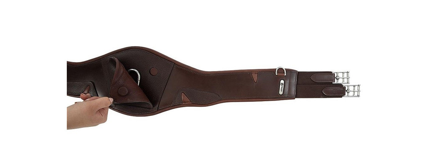 Sa forme anatomique avec découpe centrale en mousse assure une répartition homogène de la pression et un confort accru sur tous les points de contact. La fermeture magnétique recouvre la boucle du collier de chasse ou de la martingale, empêchant les fers ou bottes de s’y accrocher. Fabriquée en cuir européen souple, la sangle épouse les mouvements du cheval et évite les frottements.