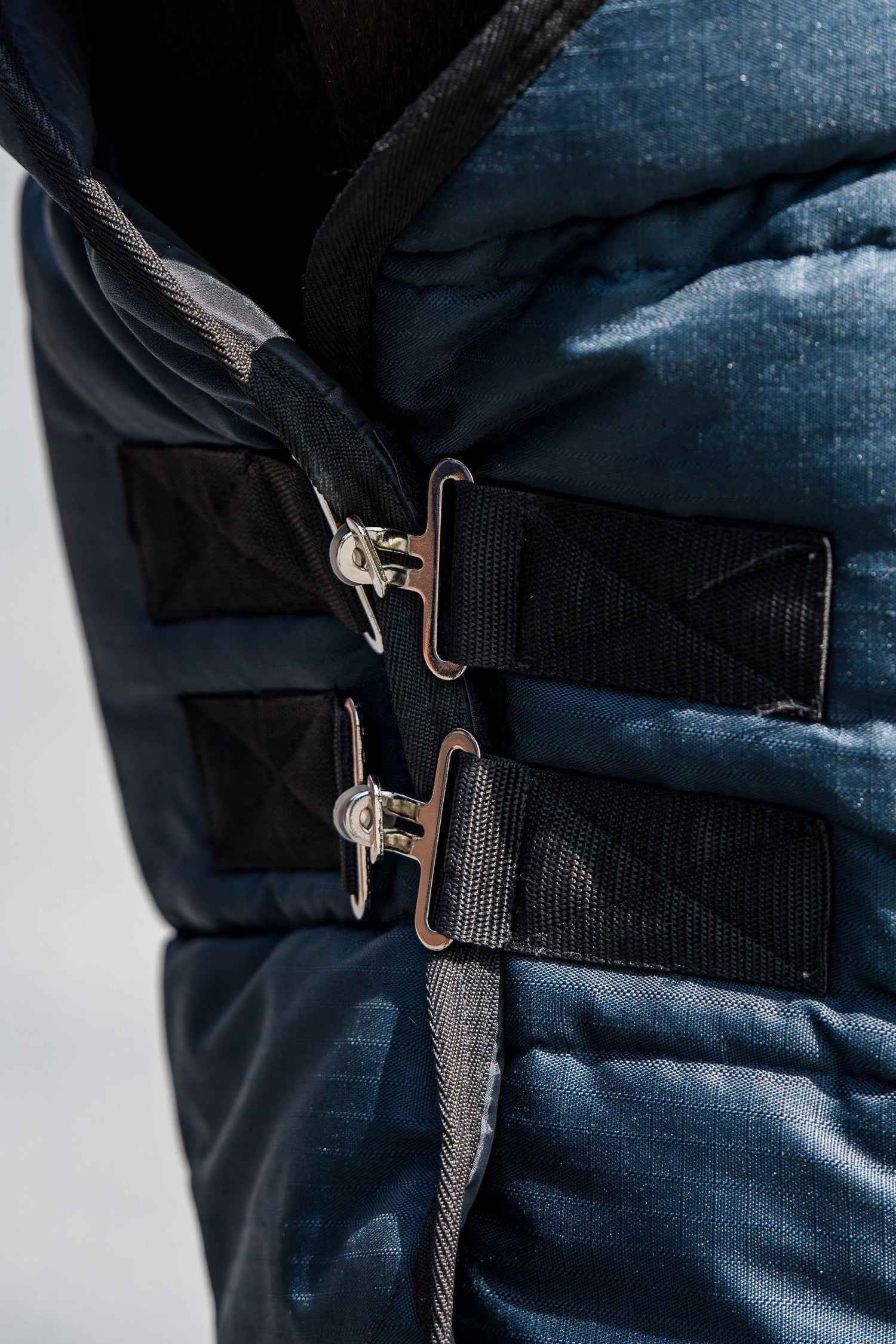 Cette couverture est garnie de polyfilling et conçue avec le système innovant Tetris. Ce système comprend des blocs souples à gauche et à droite, au niveau du garrot, créant un tunnel qui empêche la couverture de causer des pressions ou des irritations. Ainsi, le garrot du cheval repose librement dans la couverture, assurant un confort et une liberté de mouvement optimaux. De plus, la couverture reste stable, même en mouvement.